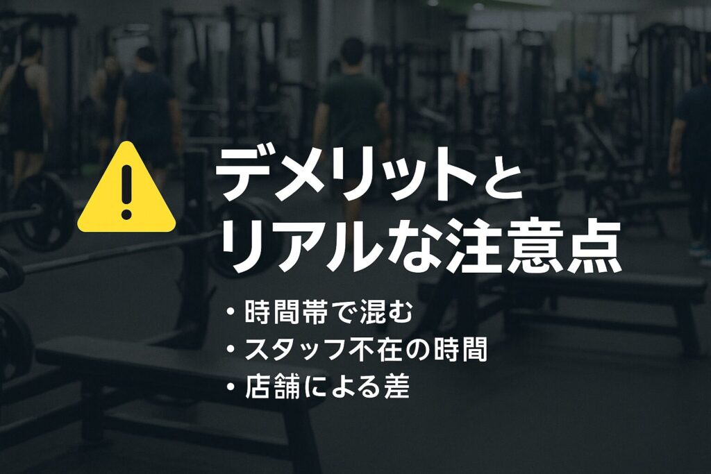 特に夕方〜夜の時間帯は利用者が集中しやすく、マシンが埋まりやすいという声が多く見られます。また、スタッフ常駐時間が限られているため、ジムに慣れていない人は不安を感じやすい点も指摘されています。