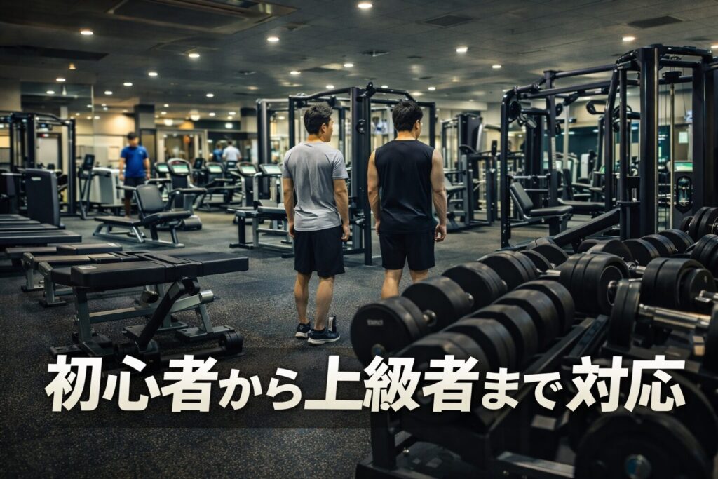 ウェイトマシン、有酸素マシン、ケーブル系などがバランス良く配置されており、初心者は安全にフォームを習得でき、上級者は狙った部位を細かく追い込めます。その結果、レベルが上がっても「物足りない」と感じにくい環境が整っています。